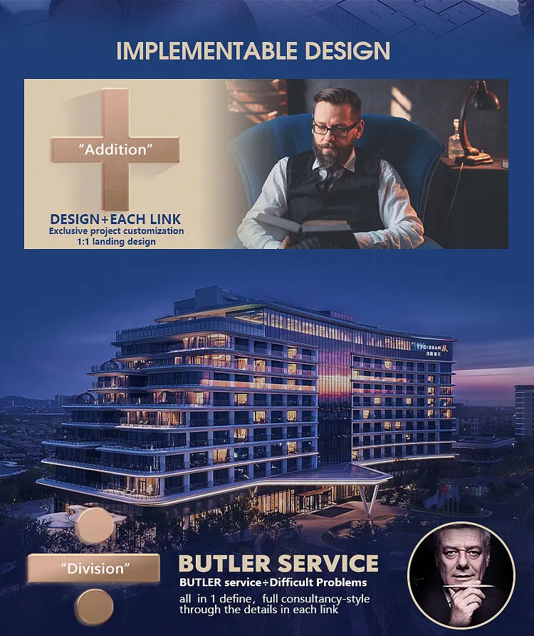 Our company has Innovative & professional design team and product team, from joinery to FF&E, no matter doors & windows, floor finishing, wall finishing or furniture, lighting or accessories, all the implement details, color schemes, material selections to be arranged by the same team, which ensure our design can be 100% landed perfectly, and no doubt on the product quality.