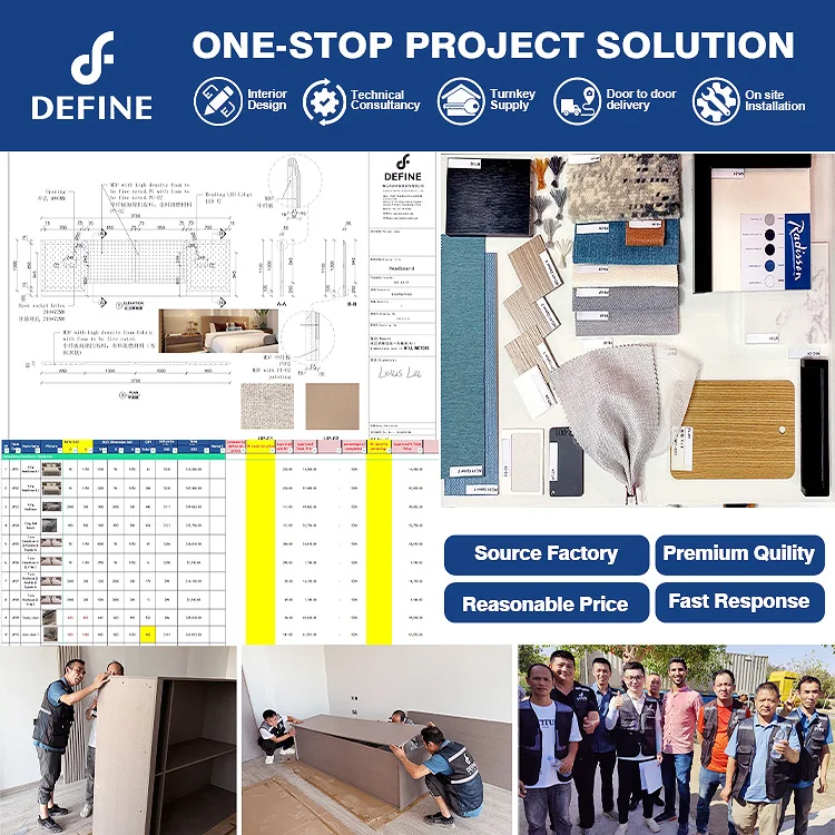 Our company has Innovative & professional design team and product team, from joinery to FF&E, no matter doors & windows, floor finishing, wall finishing or furniture, lighting or accessories, all the implement details, color schemes, material selections to be arranged by the same team, which ensure our design can be 100% landed perfectly, and no doubt on the product quality.